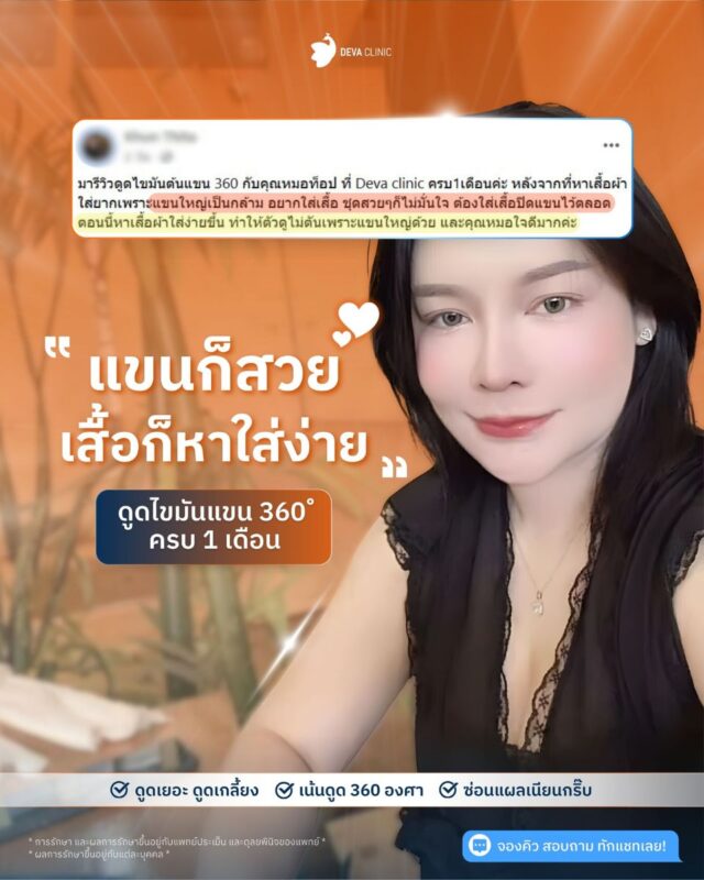 ไม่ต้องจินตนาการ เรามีหลักฐานให้ดูจากเคสจริง รวมภาพรีวิวดูดไขมันแขน 360 องศา จากลูกค้า Deva Clinic ที่เปลี่ยนจากแขนใหญ่ แขนย้วย ให้กลายเป็น “แขนตะเกียบ” เรียวสวย มั่นใจขึ้นทันตาเห็น สังเกตได้ว่าหลังทำ แขนจะดูตรง เรียว และหัวไหล่ดูเล็กลงอย่างชัดเจน