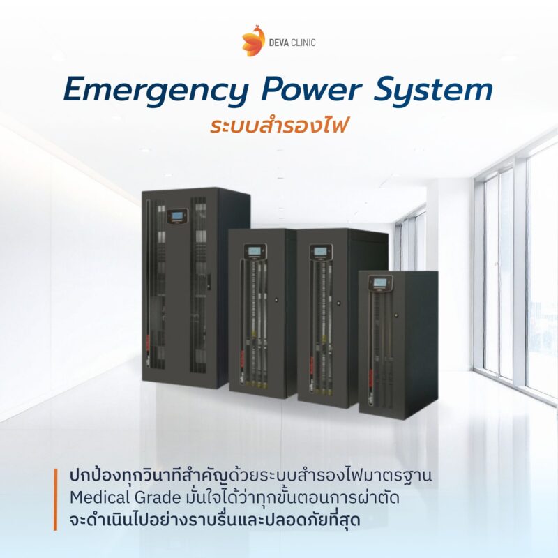 ระบบสำรองไฟมาตรฐาน Medical Grade เราปกป้องทุกวินาทีสำคัญของคุณด้วยระบบสำรองไฟที่ออกแบบมาเพื่อการใช้งานทางการแพทย์โดยเฉพาะ (Medical Grade UPS) มั่นใจได้ว่าทุกอุปกรณ์และเครื่องช่วยชีวิตจะทำงานอย่างต่อเนื่องและไม่ขาดตอน แม้ในกรณีที่เกิดกระแสไฟฟ้าขัดข้อง เพื่อความปลอดภัยสูงสุดของคนไข้และเพื่อให้ทีมแพทย์สามารถดำเนินการผ่าตัดได้อย่างราบรื่นและมั่นใจที่สุด