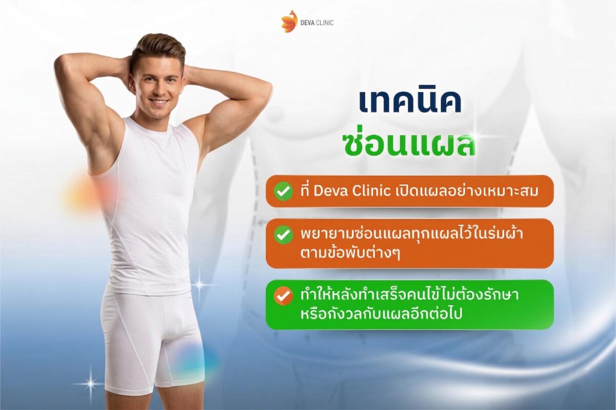 - ซ่อนแผลไว้ตามรอยพับตามธรรมชาติของร่างกาย เช่น บริเวณร่องสะดือ หรือรอยพับขาหนีบ ซึ่งเป็นจุดที่สายตาคนทั่วไปสังเกตเห็นได้ยากที่สุด